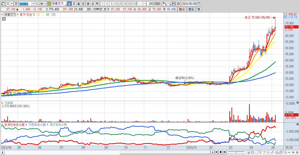 - 제룡전기 (67,100원 ▲ 2.13% , 시총: 10,778억, 거래량: 3,773,409, 거래대금:2,651억)