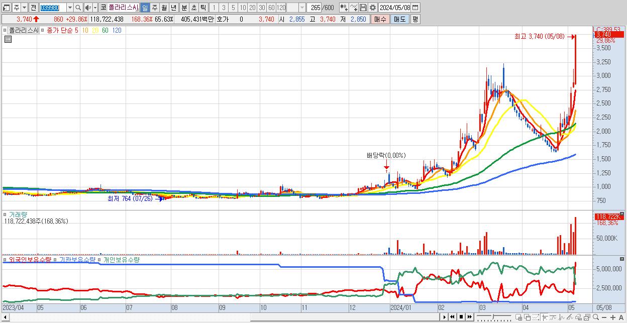 - 폴라리스AI (3,740원 ▲ 29.86% , 시총: 2,681억, 거래량: 118,722,438, 거래대금:4,054억)