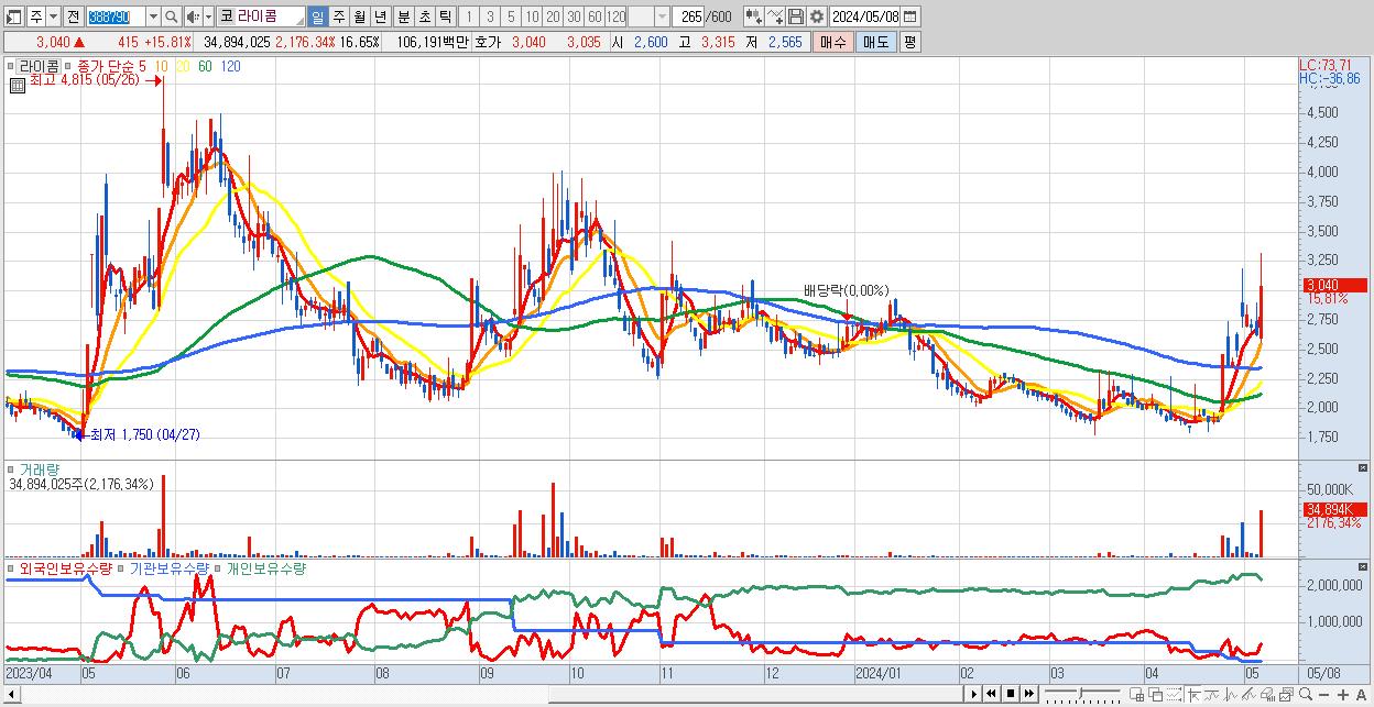 - 라이콤 (3,040원 ▲ 15.81% , 시총: 909억, 거래량: 34,894,025, 거래대금:1,062억)