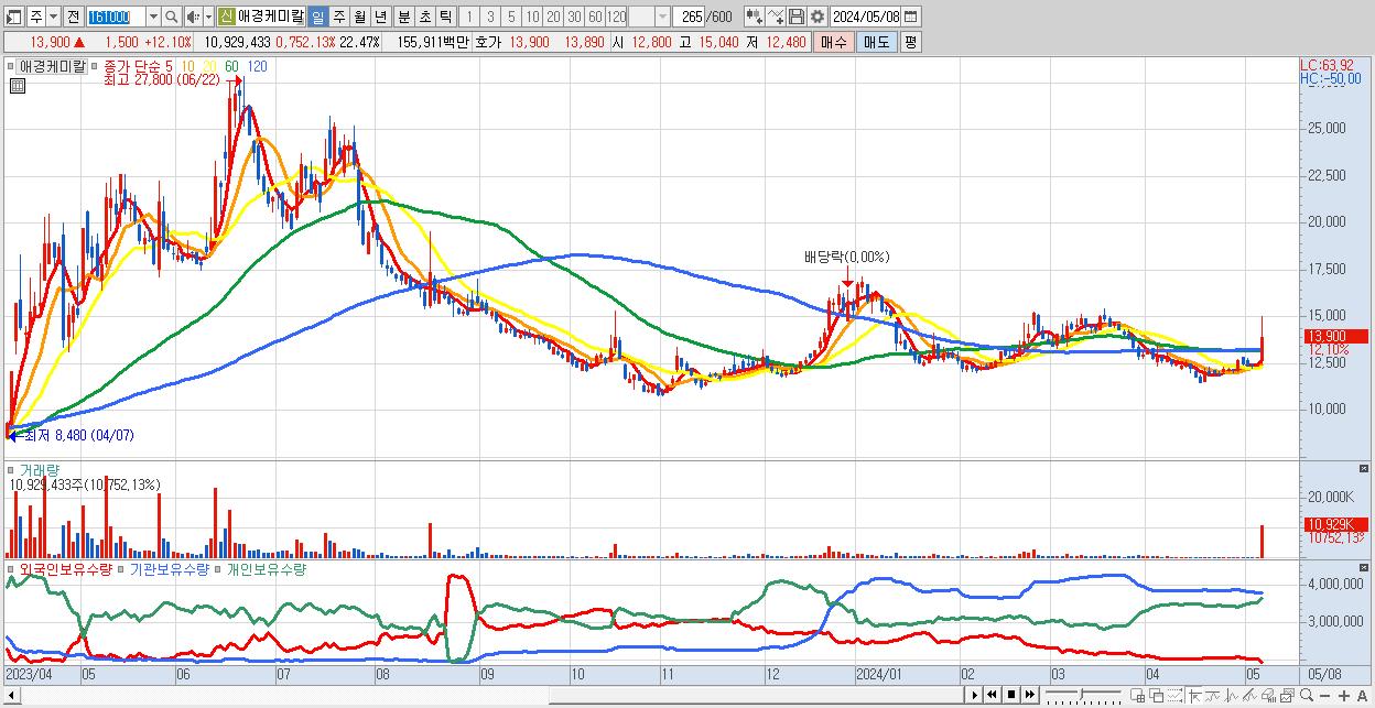 - 애경케미칼 (13,900원 ▲ 12.1% , 시총: 6,762억, 거래량: 10,929,433, 거래대금:1,559억)