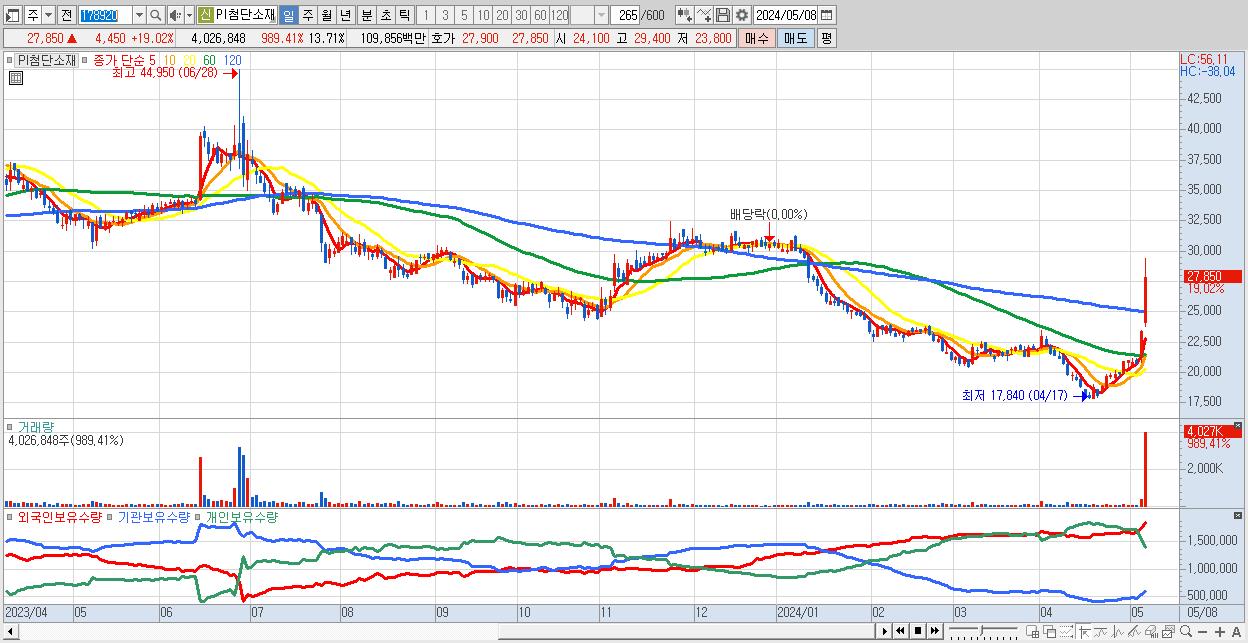 - PI첨단소재 (27,850원 ▲ 19.02% , 시총: 8,179억, 거래량: 4,026,848, 거래대금:1,099억)