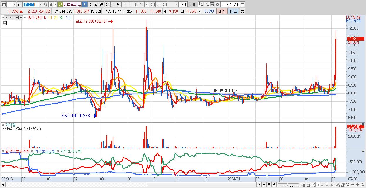 - 비츠로테크 (11,350원 ▲ 24.32% , 시총: 2,974억, 거래량: 37,644,073, 거래대금:4,032억)