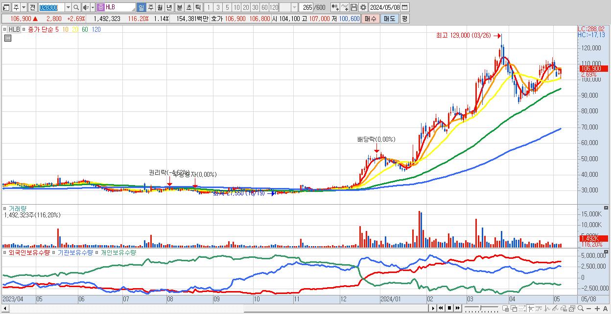 - HLB (106,900원 ▲ 2.69% , 시총: 139,858억, 거래량: 1,492,323, 거래대금:1,544억)
