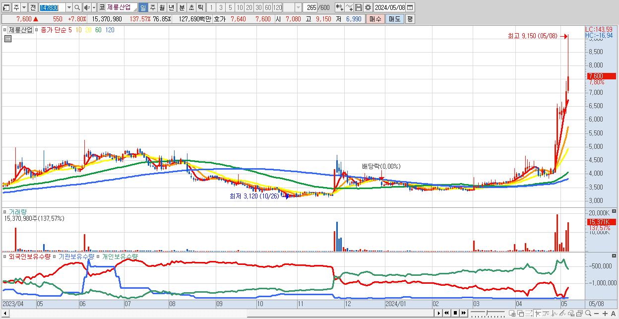 - 제룡산업 (7,600원 ▲ 7.8% , 시총: 1,520억, 거래량: 15,370,980, 거래대금:1,277억)