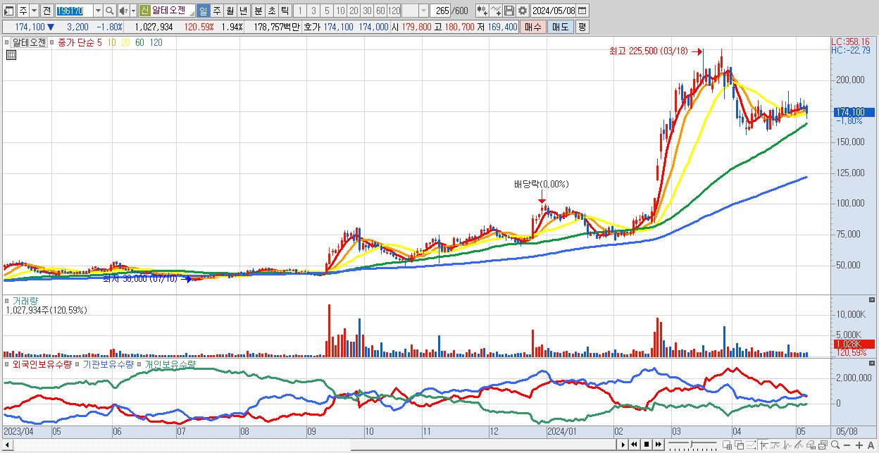 - 알테오젠 (174,100원 ▼ -1.8% , 시총: 92,294억, 거래량: 1,027,934, 거래대금:1,788억)