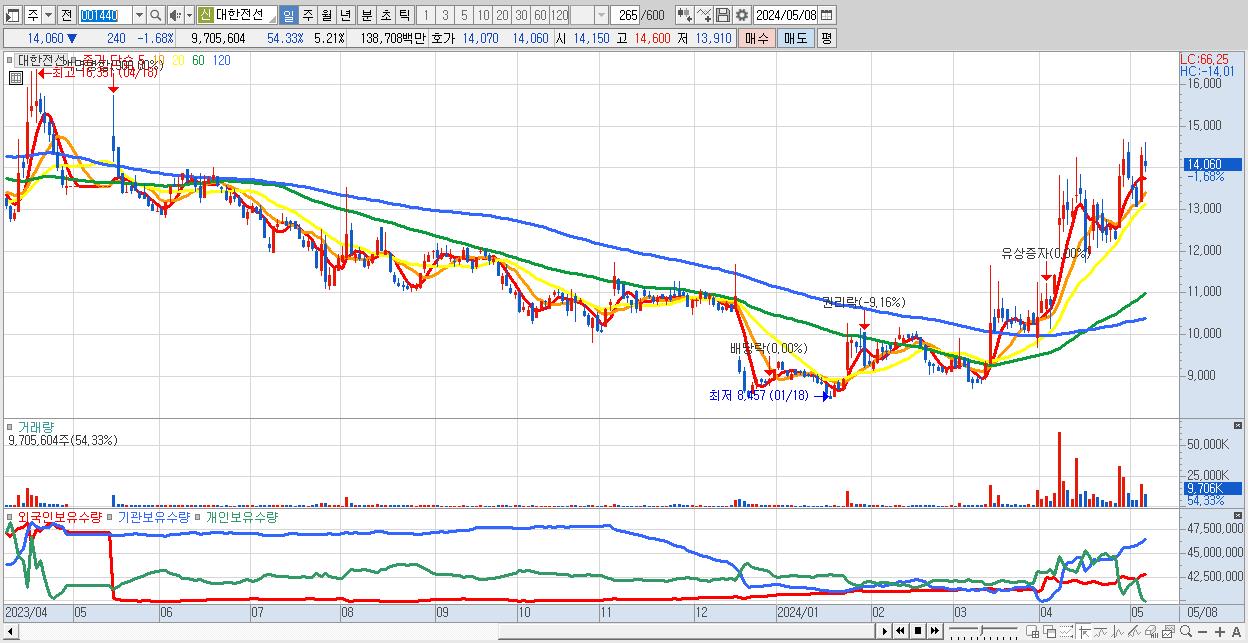 - 대한전선 (14,060원 ▼ -1.68% , 시총: 26,214억, 거래량: 9,705,604, 거래대금:1,387억)