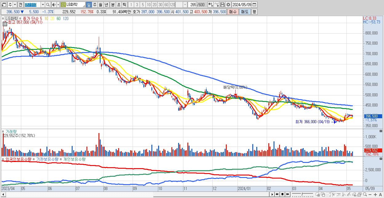 - LG화학 (396,500원 ▼ -1.37% , 시총: 279,899억, 외국인 순매수 거래금:110억)