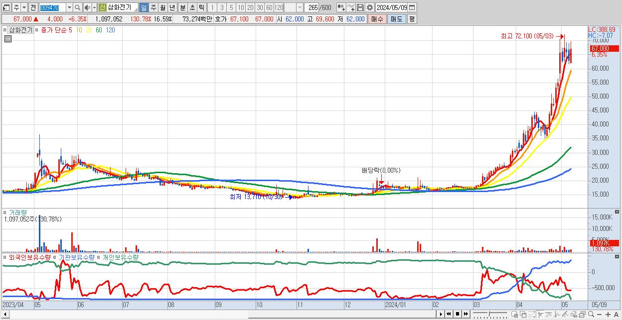 - 삼화전기 (67,000원 ▲ 6.35% , 시총: 4,431억, 외국인 순매수 거래금:59억)