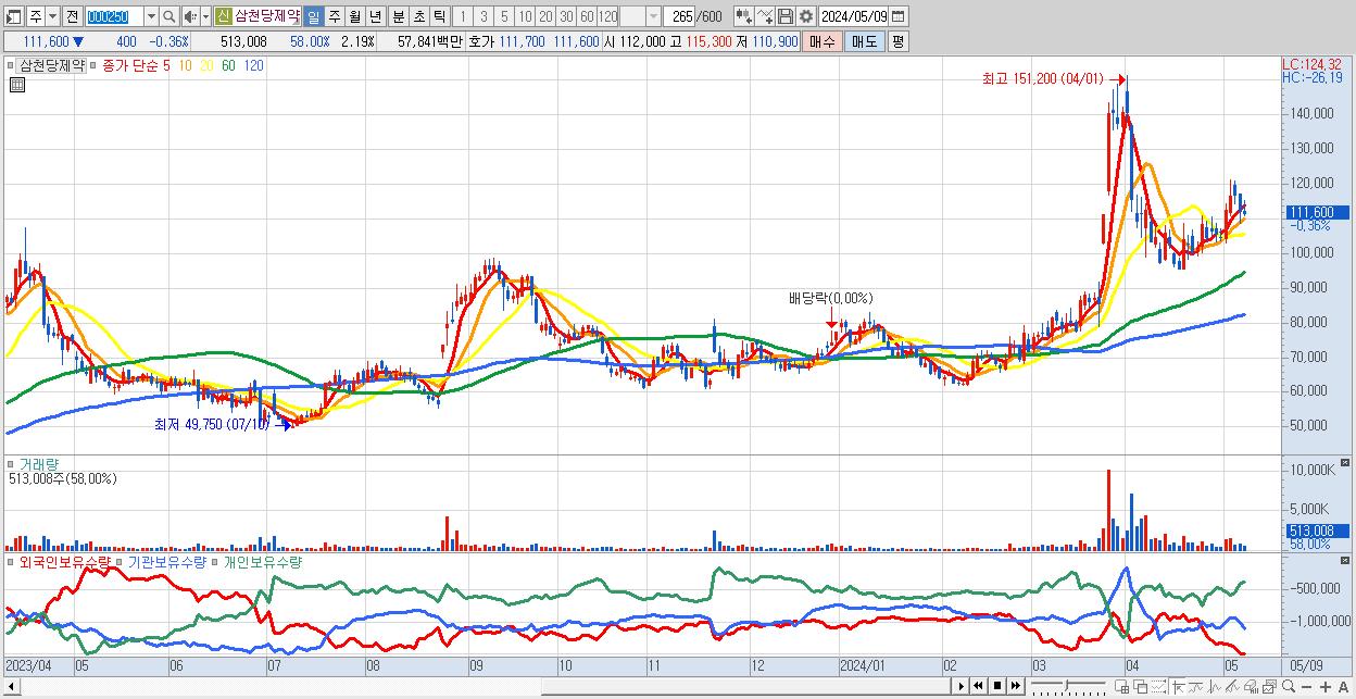 - 삼천당제약 (111,600원 ▼ -0.36% , 시총: 26,179억, 외국인 순매수 거래금:50억)