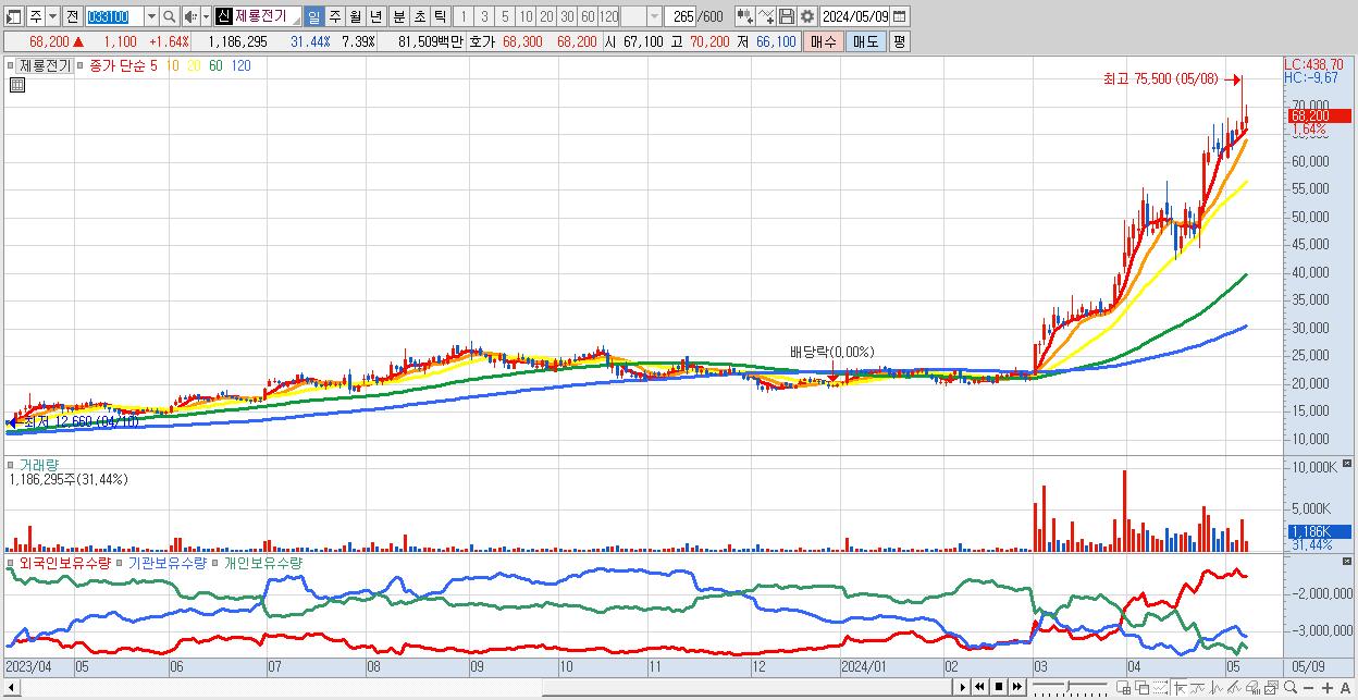 - 제룡전기 (68,200원 ▲ 1.64% , 시총: 10,955억, 외국인 순매수 거래금:108억)