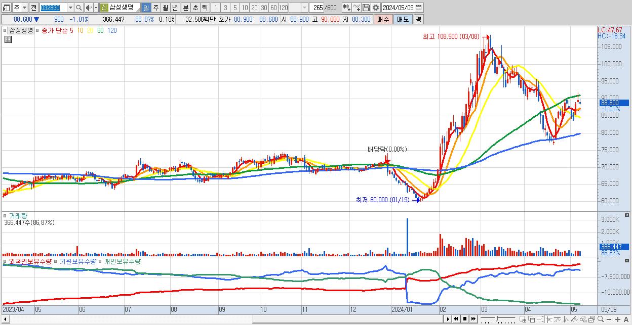 - 삼성생명 (88,600원 ▼ -1.01% , 시총: 177,200억, 외국인 순매수 거래금:54억)