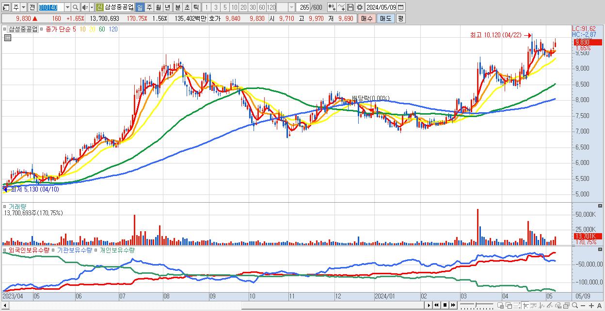 - 삼성중공업 (9,830원 ▲ 1.65% , 시총: 86,504억, 외국인 순매수 거래금:260억)