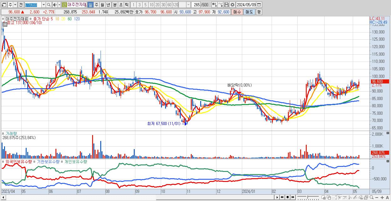 - 대주전자재료 (96,600원 ▲ 2.77% , 시총: 14,954억, 외국인 순매수 거래금:75억)