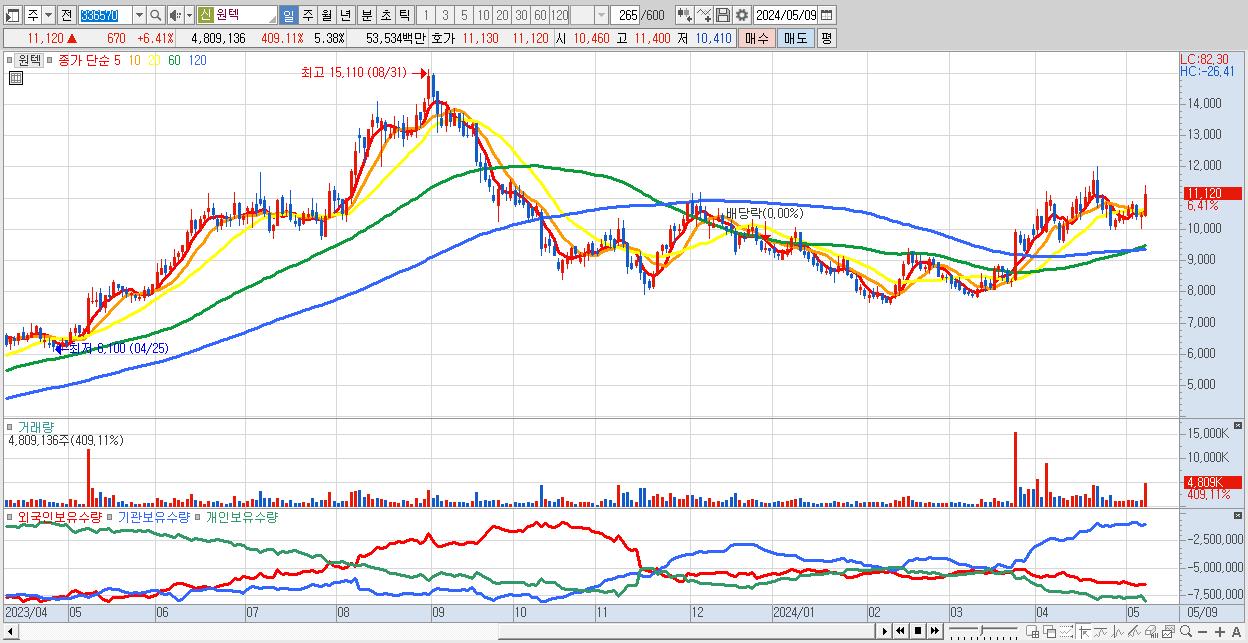 - 원텍 (11,120원 ▲ 6.41% , 시총: 9,935억, 외국인 순매수 거래금:51억)