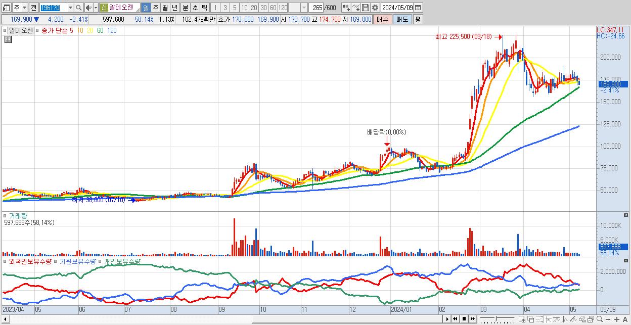 - 알테오젠 (169,900원 ▼ -2.41% , 시총: 90,067억, 외국인 순매수 거래금:47억)