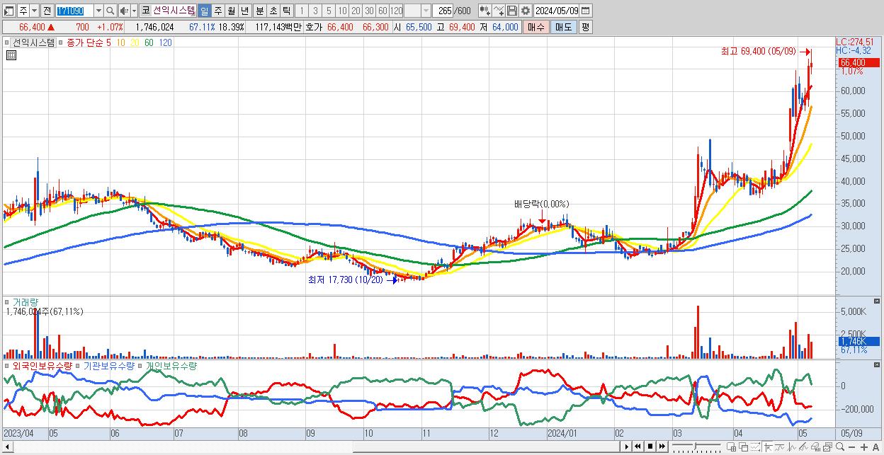 - 선익시스템 (66,400원 ▲ 1.07% , 시총: 6,304억, 외국인 순매수 거래금:63억)