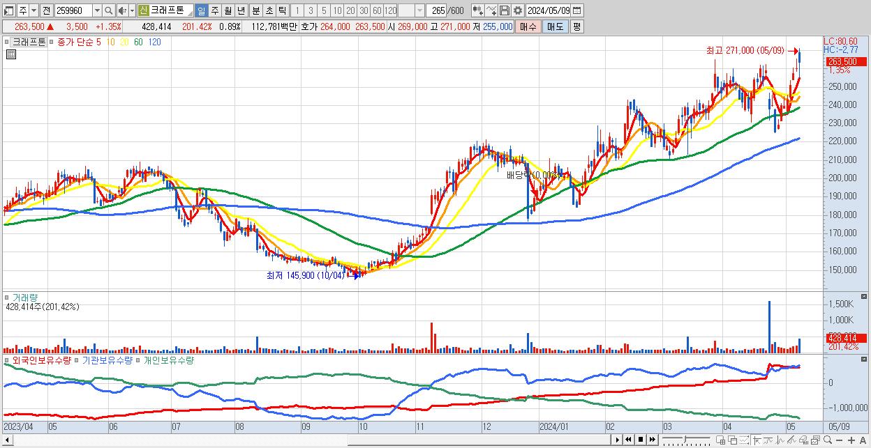 - 크래프톤 (263,500원 ▲ 1.35% , 시총: 127,440억, 외국인 순매수 거래금:135억)