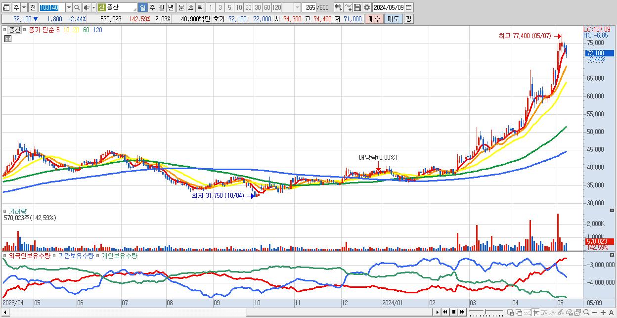 - 풍산 (72,100원 ▼ -2.44% , 시총: 20,206억, 외국인 순매수 거래금:97억)