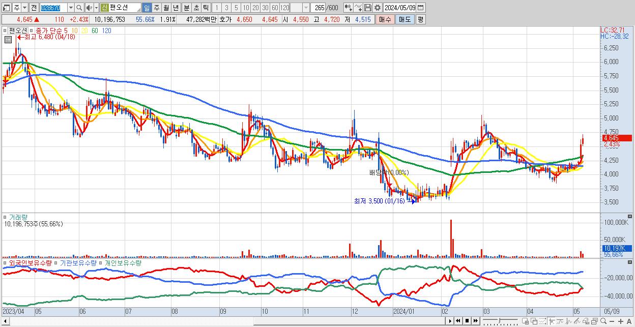 - 팬오션 (4,645원 ▲ 2.43% , 시총: 24,831억, 외국인 순매수 거래금:83억)