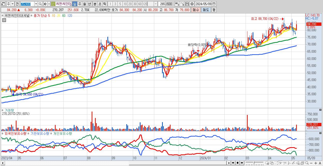 - 씨앤씨인터내셔널 (84,200원 ▲ 8.09% , 시총: 8,432억, 외국인 순매수 거래금:52억)