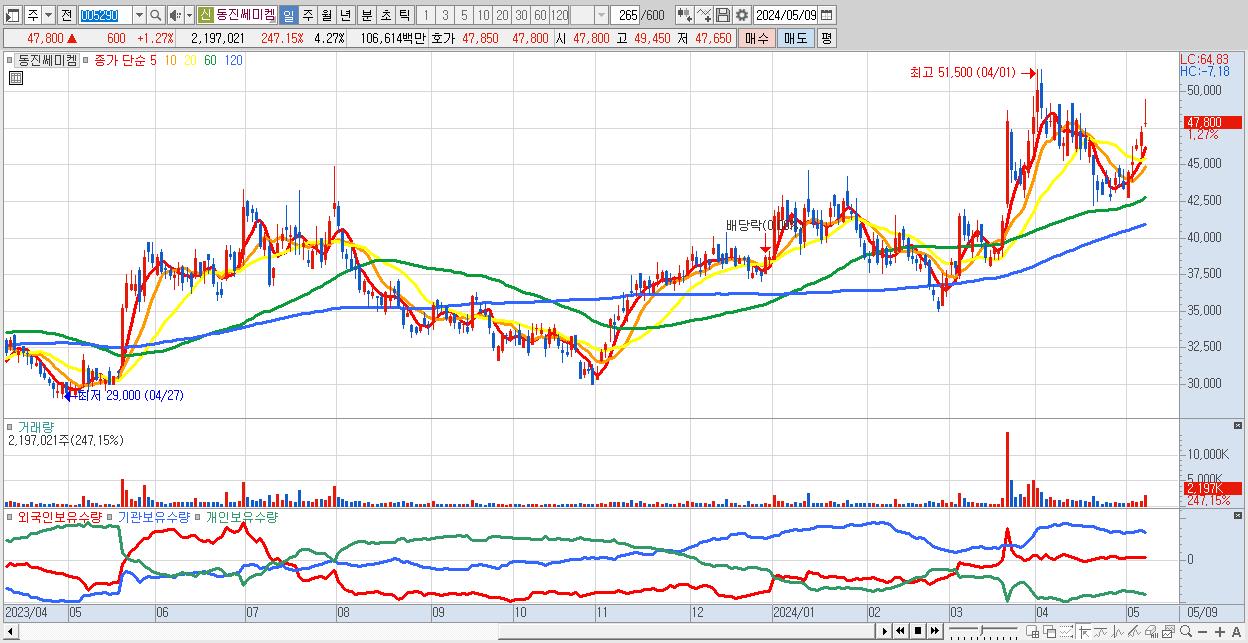- 동진쎄미켐 (47,800원 ▲ 1.27% , 시총: 24,576억, 외국인 순매수 거래금:75억)