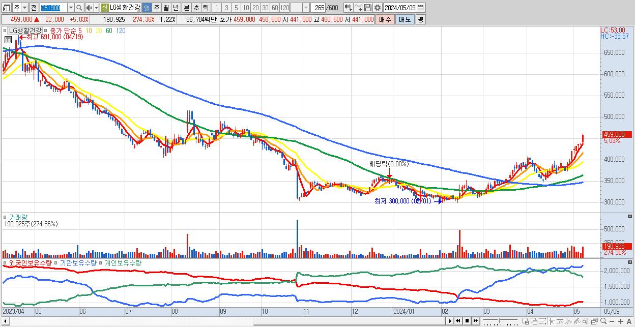 - LG생활건강 (459,000원 ▲ 5.03% , 시총: 71,688억, 외국인 순매수 거래금:100억)