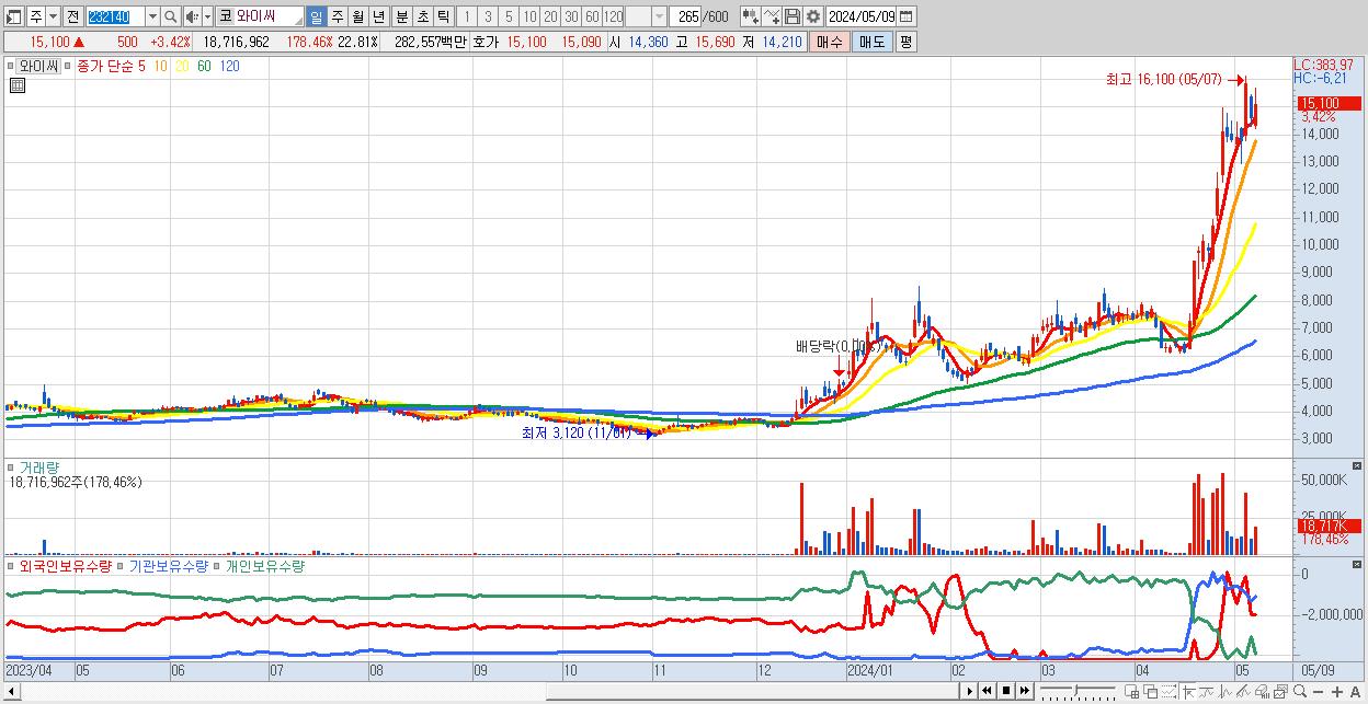 - 와이씨 (15,100원 ▲ 3.42% , 시총: 12,389억, 외국인 순매수 거래금:112억)