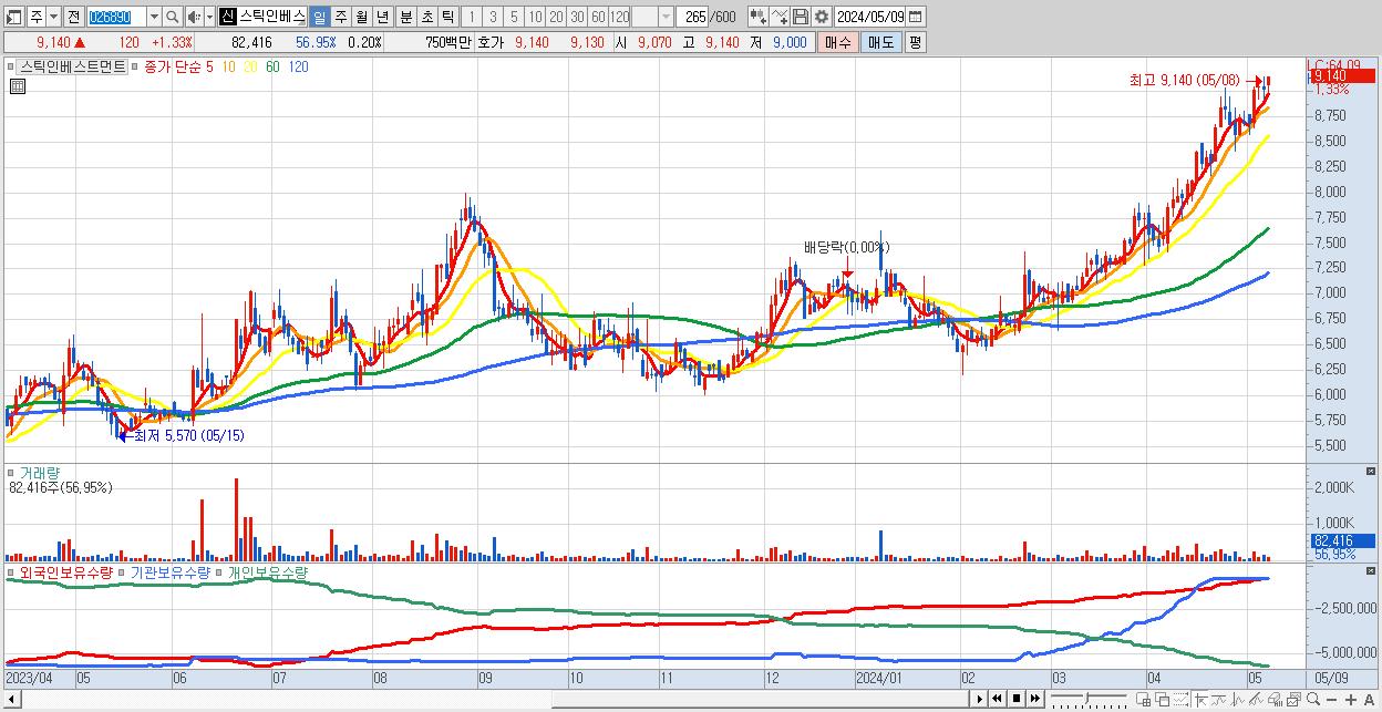 - 스틱인베스트먼트 (9,140원 ▲ 1.33% , 시총: 3,809억, 거래량: 82,416, 거래대금:7억, KOSPI)