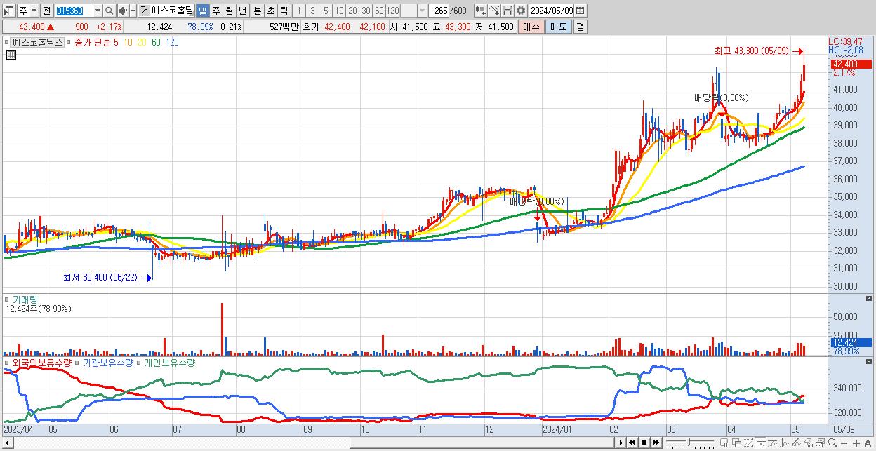 - 예스코홀딩스 (42,400원 ▲ 2.17% , 시총: 2,544억, 거래량: 12,424, 거래대금:5억, KOSPI)