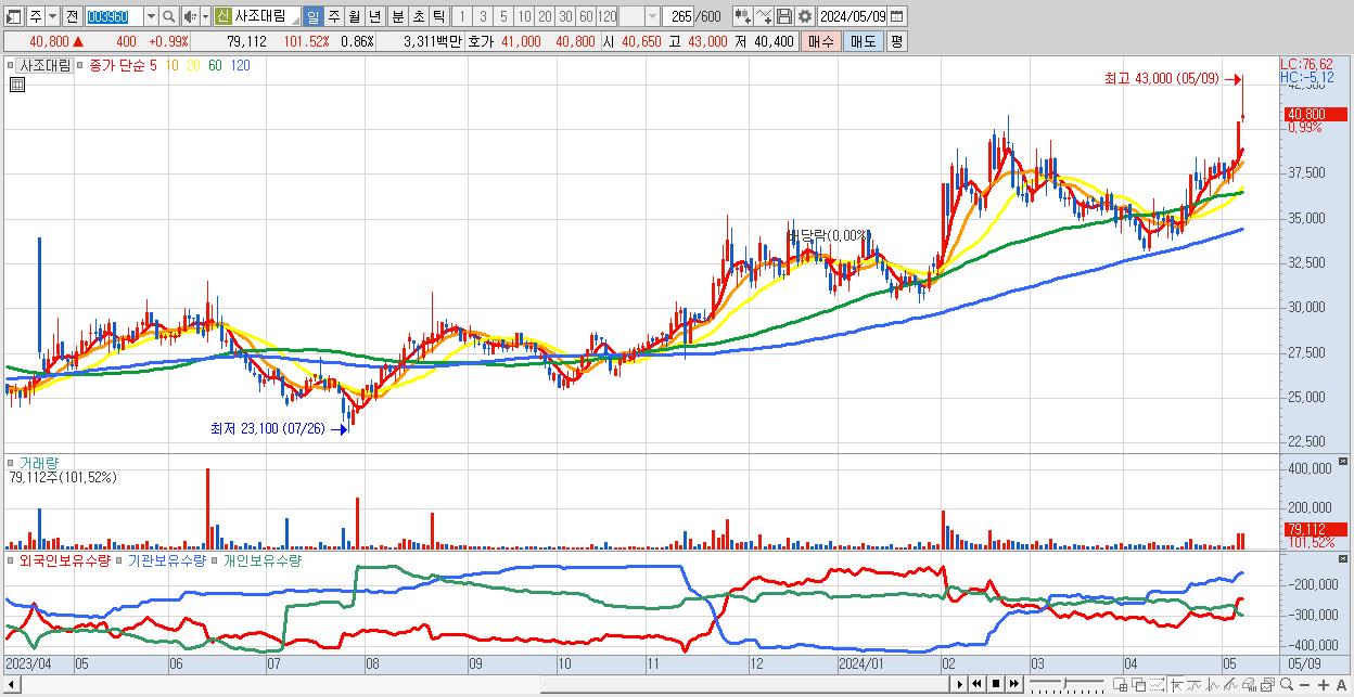 사조대림 40,800원 ▲ 0.99% (KOSPI, 003960)