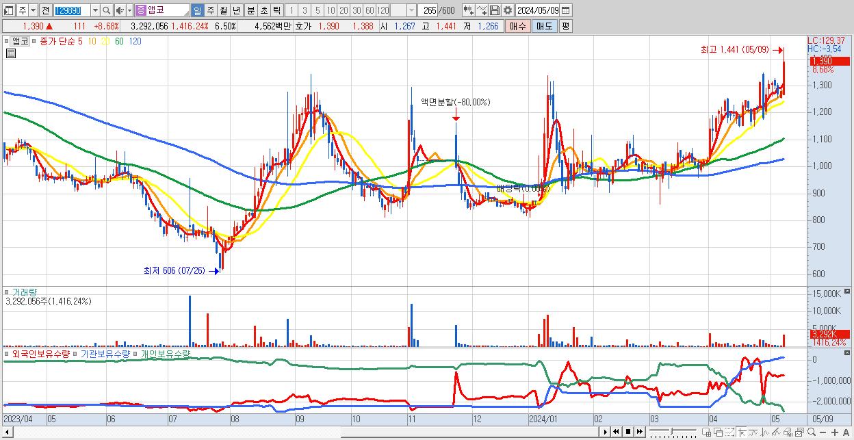 - 앱코 (1,390원 ▲ 8.68% , 시총: 704억, 거래량: 3,292,056, 거래대금:46억, KOSDAQ)
