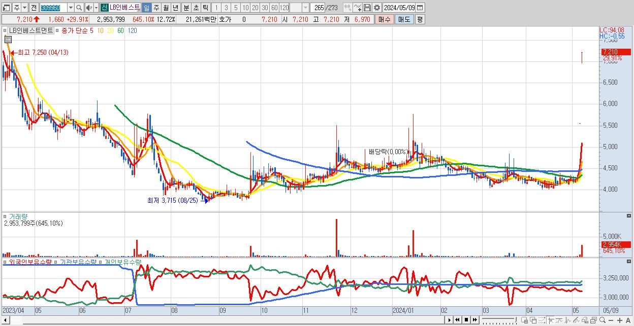 - LB인베스트먼트 (7,210원 ▲ 29.91% , 시총: 1,674억, 거래량: 2,953,799, 거래대금:213억, KOSDAQ)