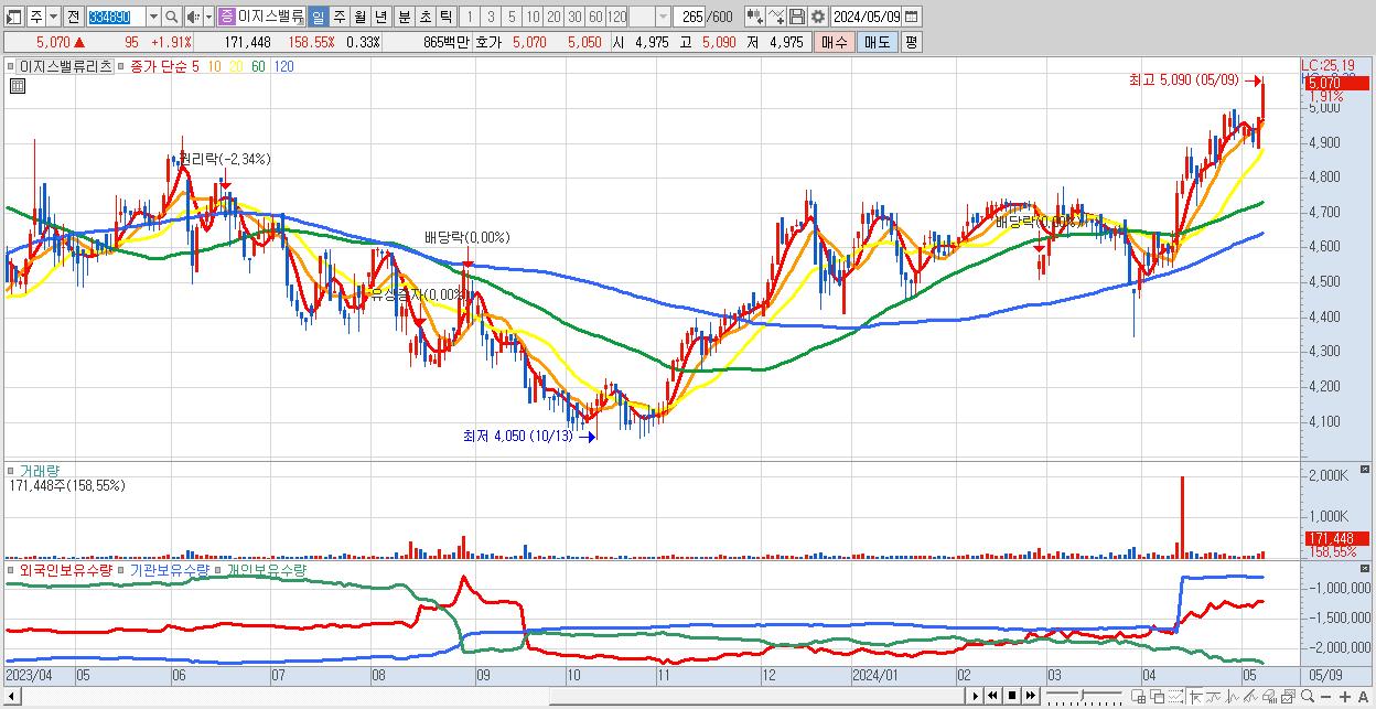 - 이지스밸류리츠 (5,070원 ▲ 1.91% , 시총: 2,608억, 거래량: 171,448, 거래대금:9억, KOSPI)