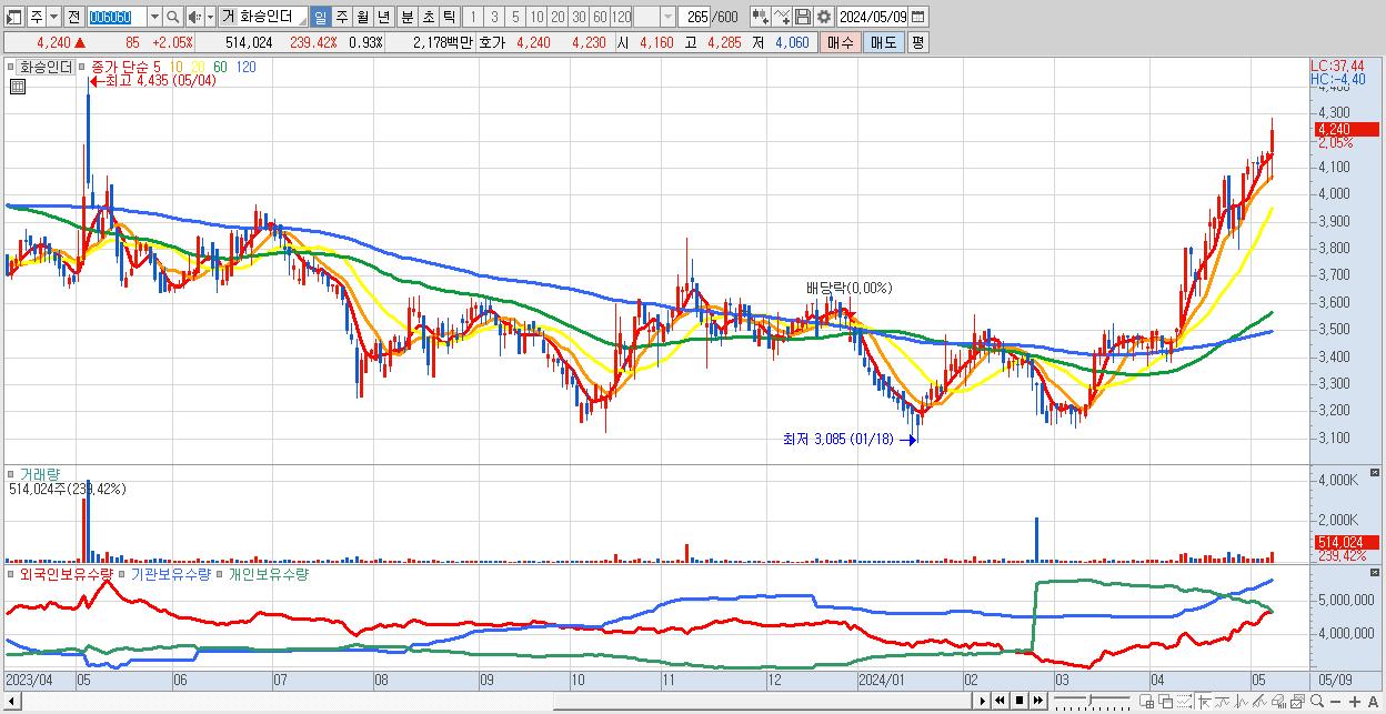 - 화승인더 (4,240원 ▲ 2.05% , 시총: 2,346억, 거래량: 514,024, 거래대금:22억, KOSPI)