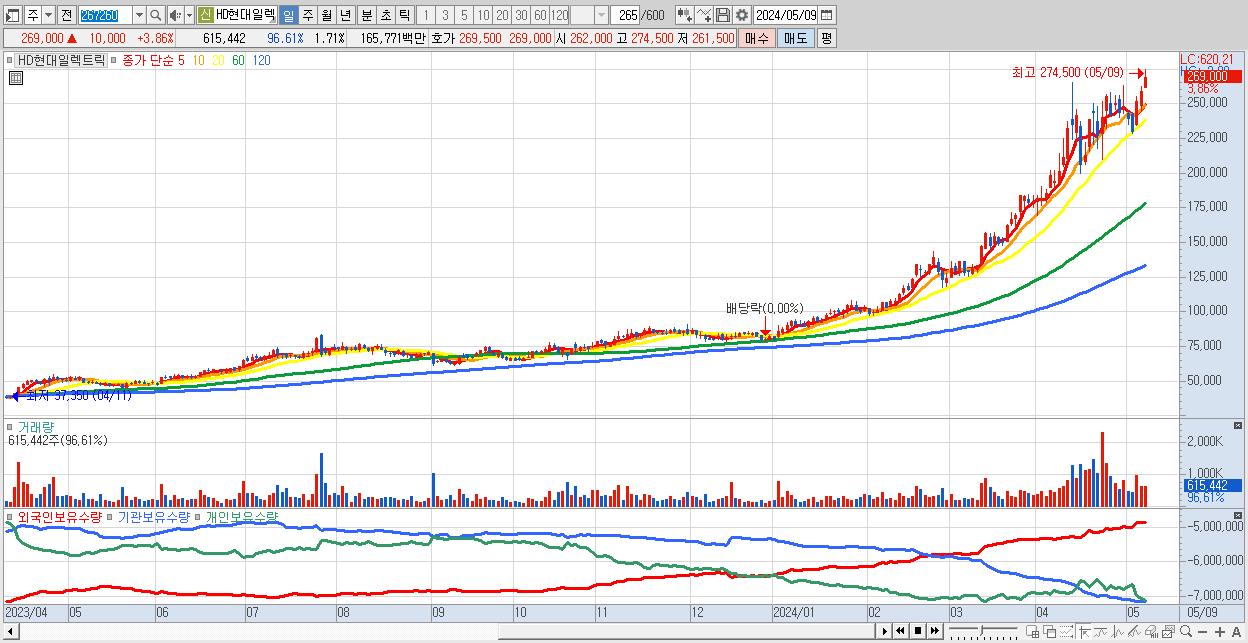 - HD현대일렉트릭 (269,000원 ▲ 3.86% , 시총: 96,967억, 거래량: 615,442, 거래대금:1,658억, KOSPI)