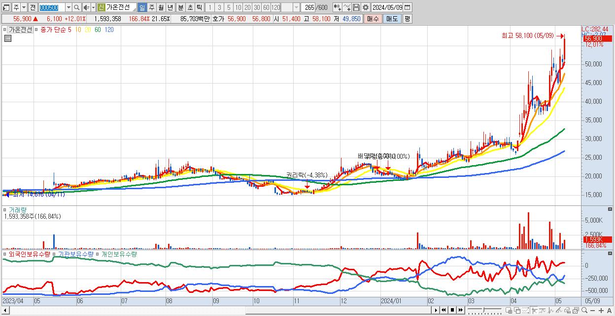 - 가온전선 (56,900원 ▲ 12.01% , 시총: 4,187억, 거래량: 1,593,358, 거래대금:857억, KOSPI)