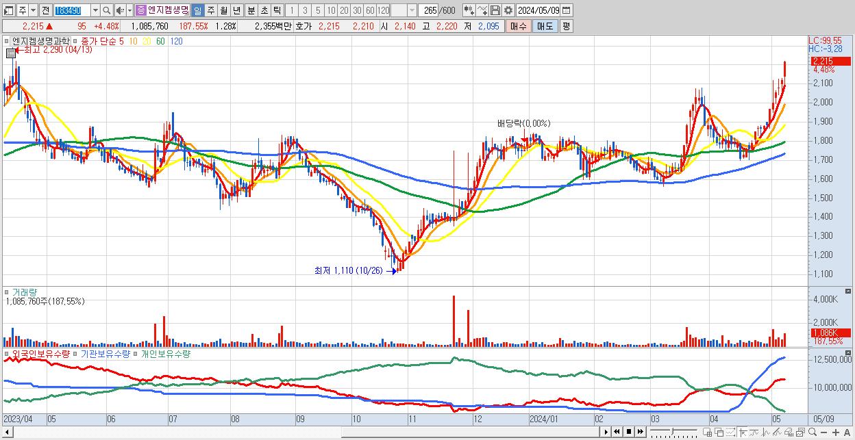 - 엔지켐생명과학 (2,215원 ▲ 4.48% , 시총: 1,884억, 거래량: 1,085,760, 거래대금:24억, KOSDAQ)