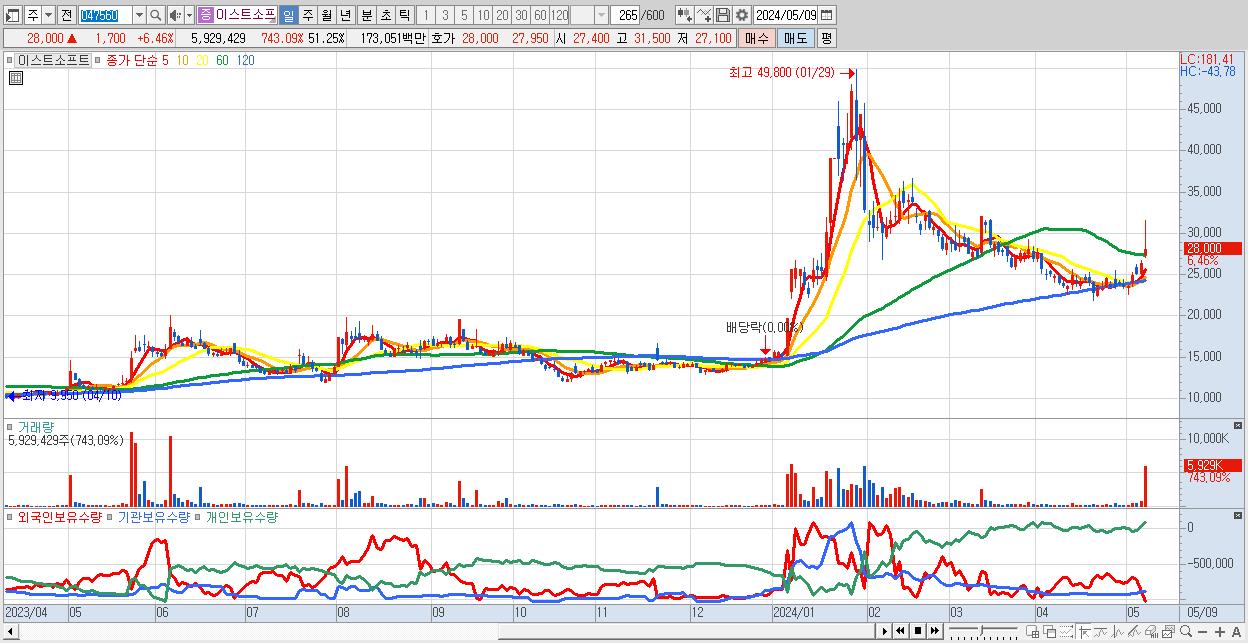 - 이스트소프트 (28,000원 ▲ 6.46% , 시총: 3,239억, 거래량: 5,929,429, 거래대금:1,731억)
