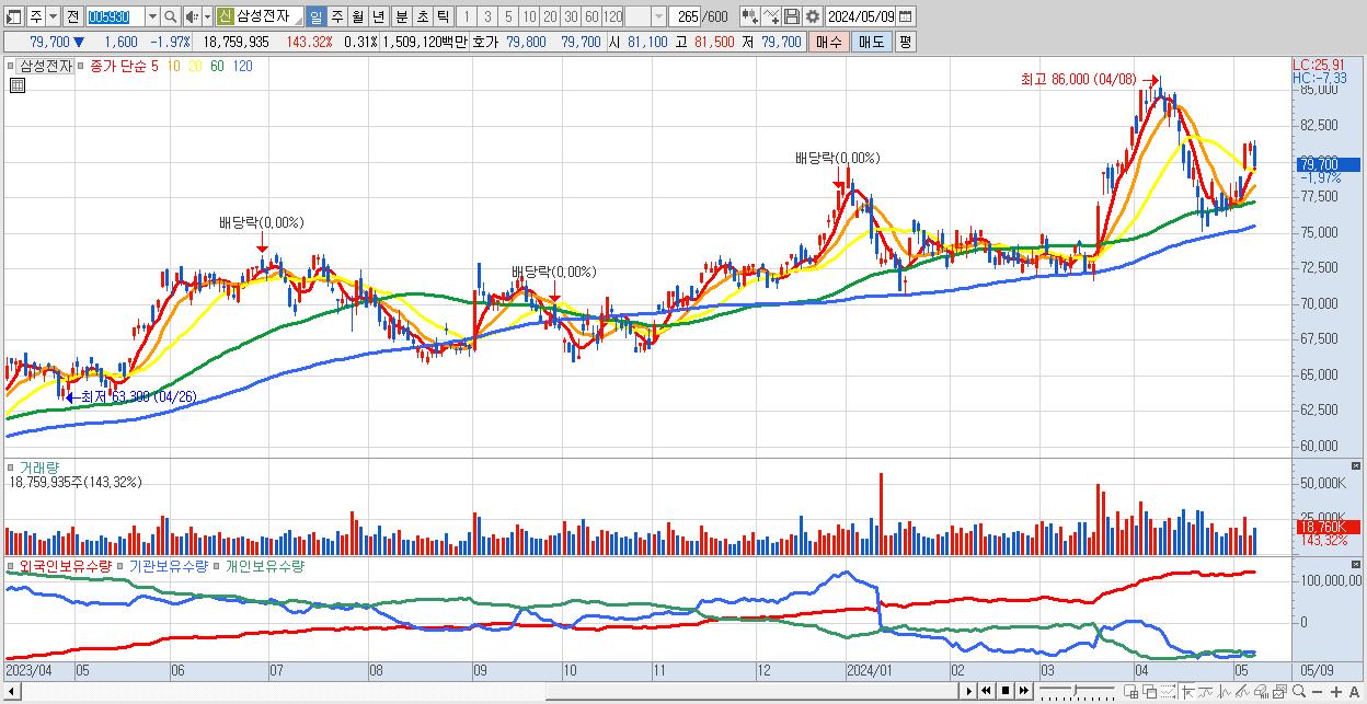 - 삼성전자 (79,700원 ▼ -1.97% , 시총: 4,757,917억, 거래량: 18,759,935, 거래대금:15,091억)