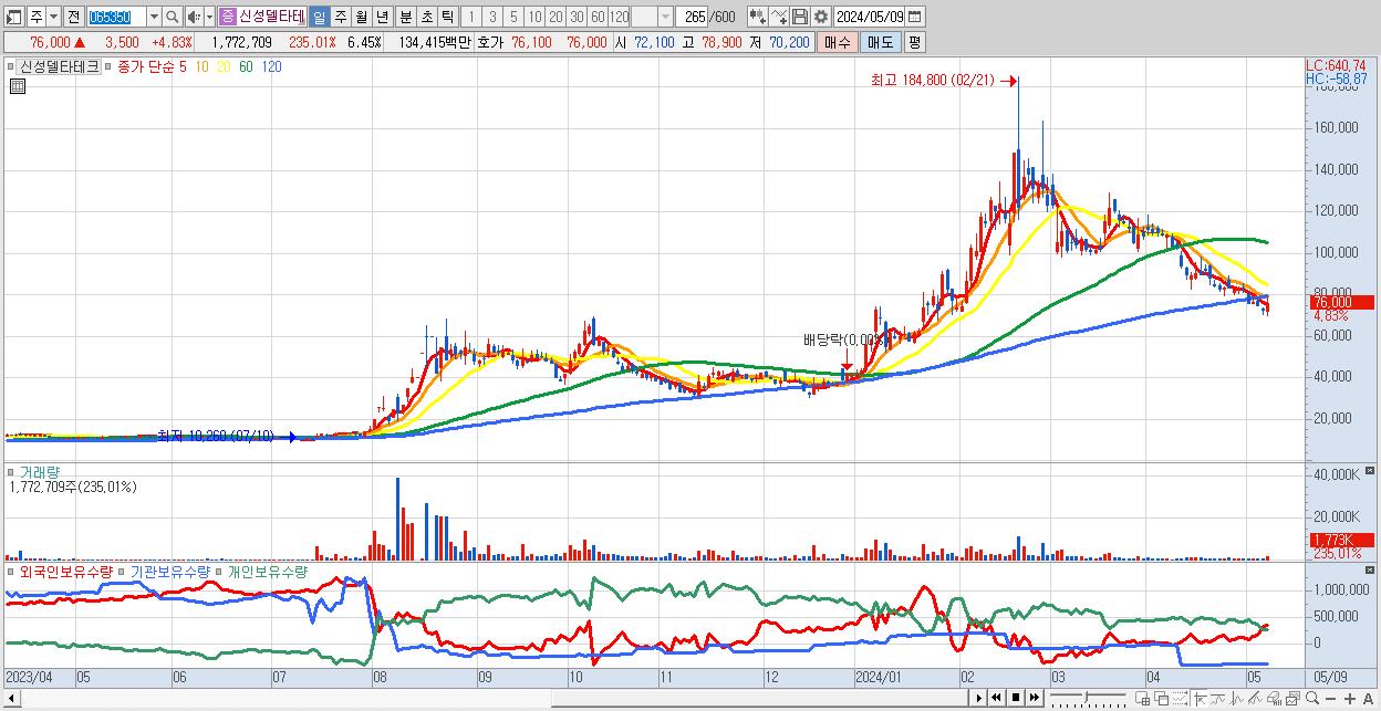 - 신성델타테크 (76,000원 ▲ 4.83% , 시총: 20,888억, 거래량: 1,772,709, 거래대금:1,344억)