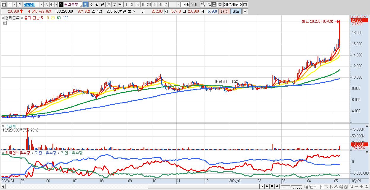 - 실리콘투 (20,200원 ▲ 29.82% , 시총: 12,199억, 거래량: 13,529,588, 거래대금:2,586억)
