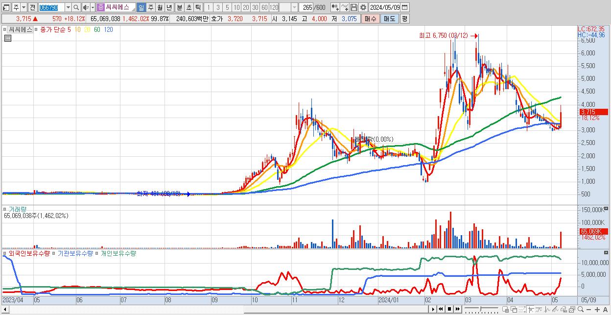 - 씨씨에스 (3,715원 ▲ 18.12% , 시총: 2,420억, 거래량: 65,069,038, 거래대금:2,406억)