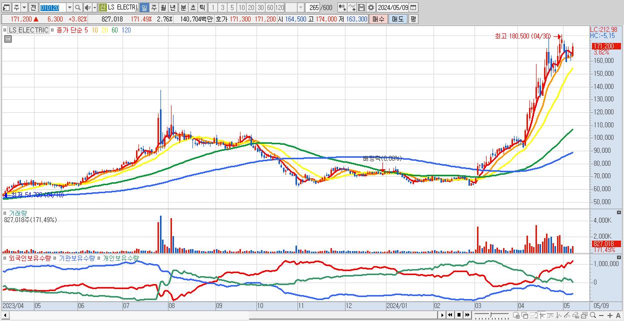 - LS ELECTRIC (171,200원 ▲ 3.82% , 시총: 51,360억, 거래량: 827,018, 거래대금:1,407억)