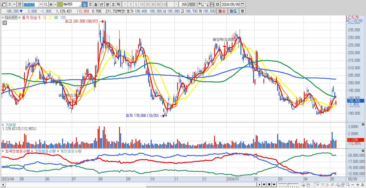 - NAVER (188,300원 ▼ -1.36% , 시총: 305,815억, 거래량: 1,129,421, 거래대금:2,117억)