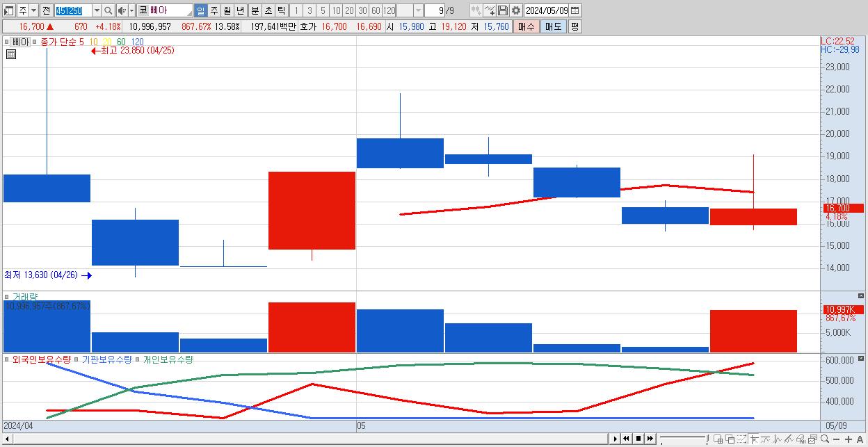 - 삐아 (16,700원 ▲ 4.18% , 시총: 1,617억, 거래량: 10,996,957, 거래대금:1,976억)