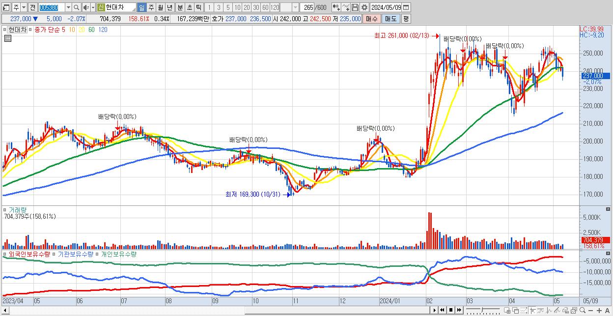 - 현대차 (237,000원 ▼ -2.07% , 시총: 496,316억, 거래량: 704,379, 거래대금:1,672억)