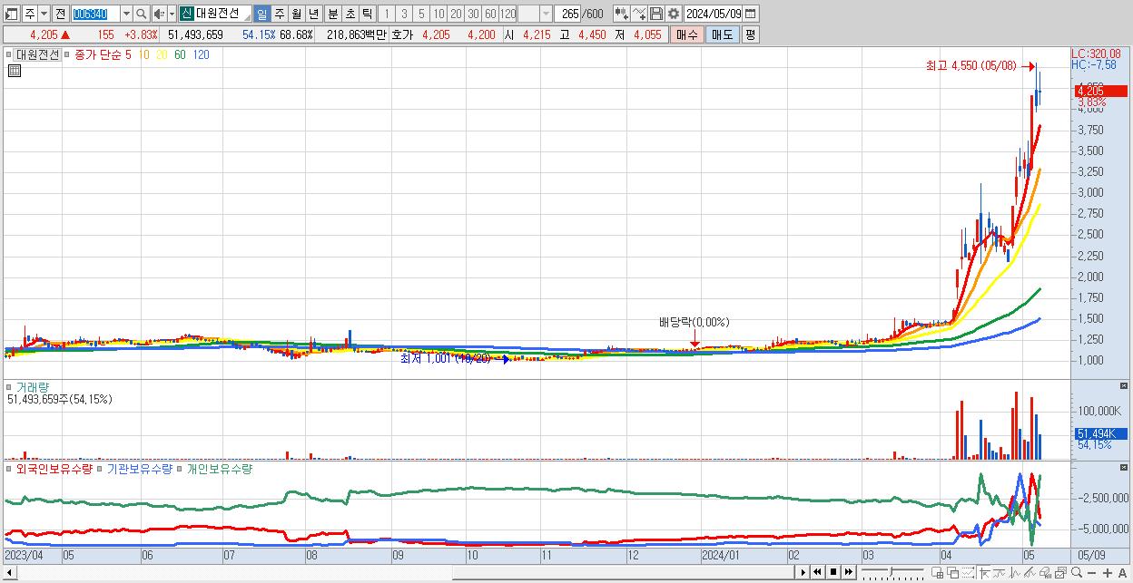 - 대원전선 (4,205원 ▲ 3.83% , 시총: 3,153억, 거래량: 51,493,659, 거래대금:2,189억)