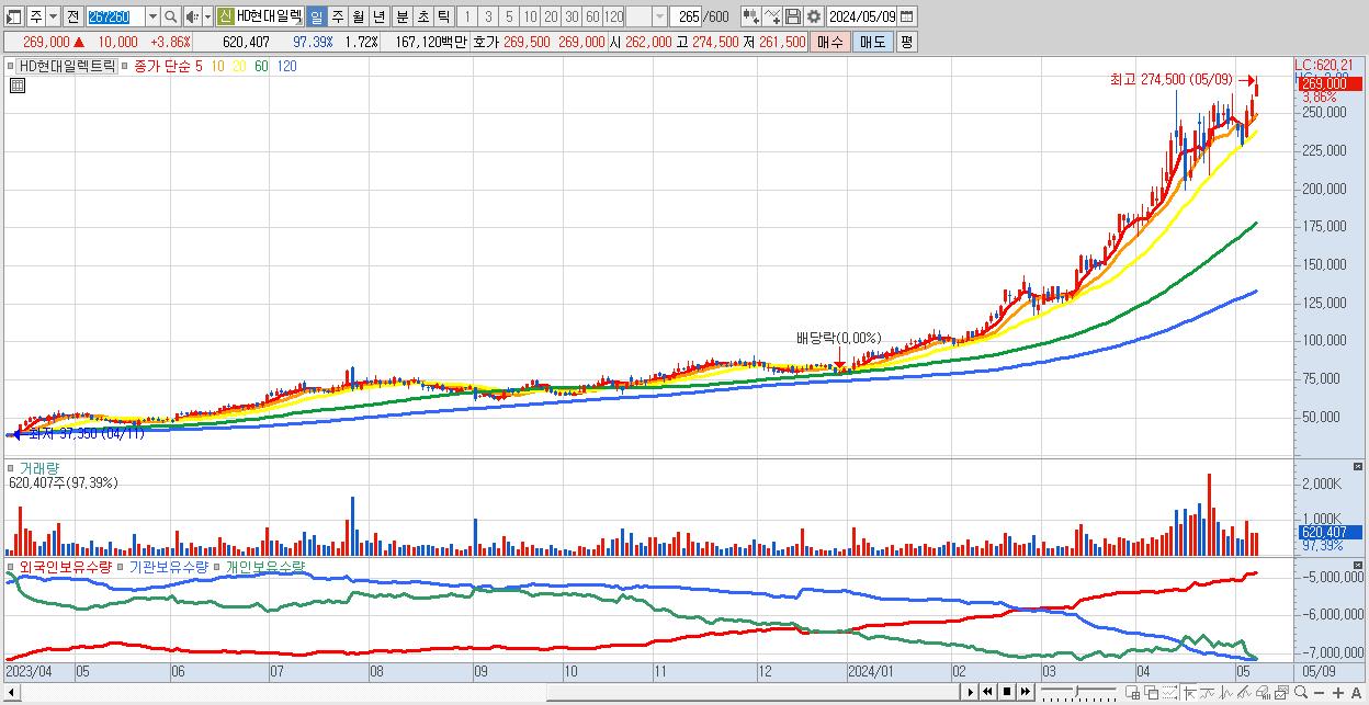 - HD현대일렉트릭 (269,000원 ▲ 3.86% , 시총: 96,967억, 거래량: 620,407, 거래대금:1,671억)