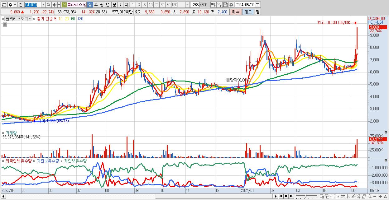 - 폴라리스오피스 (9,660원 ▲ 22.74% , 시총: 4,803억, 거래량: 63,973,964, 거래대금:5,770억)