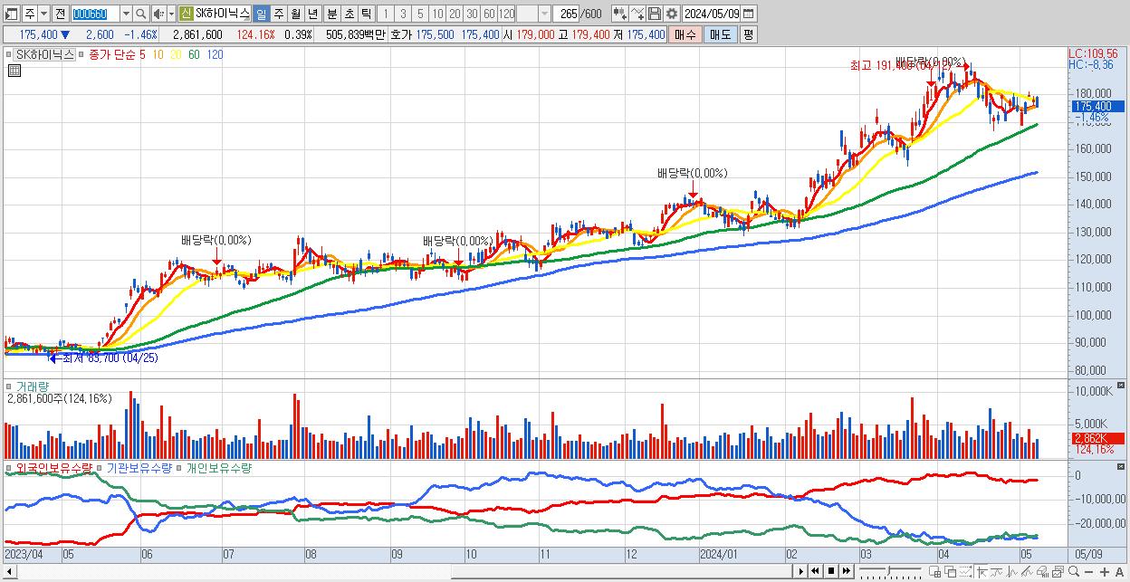 - SK하이닉스 (175,400원 ▼ -1.46% , 시총: 1,276,916억, 거래량: 2,861,600, 거래대금:5,058억)